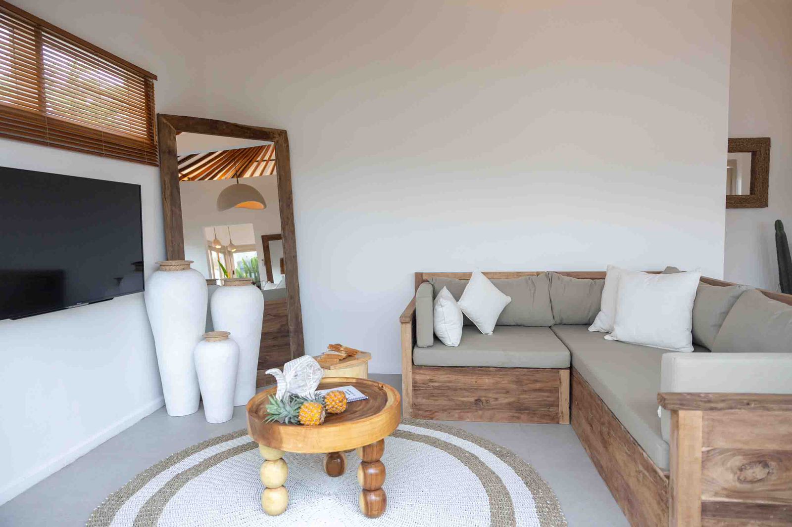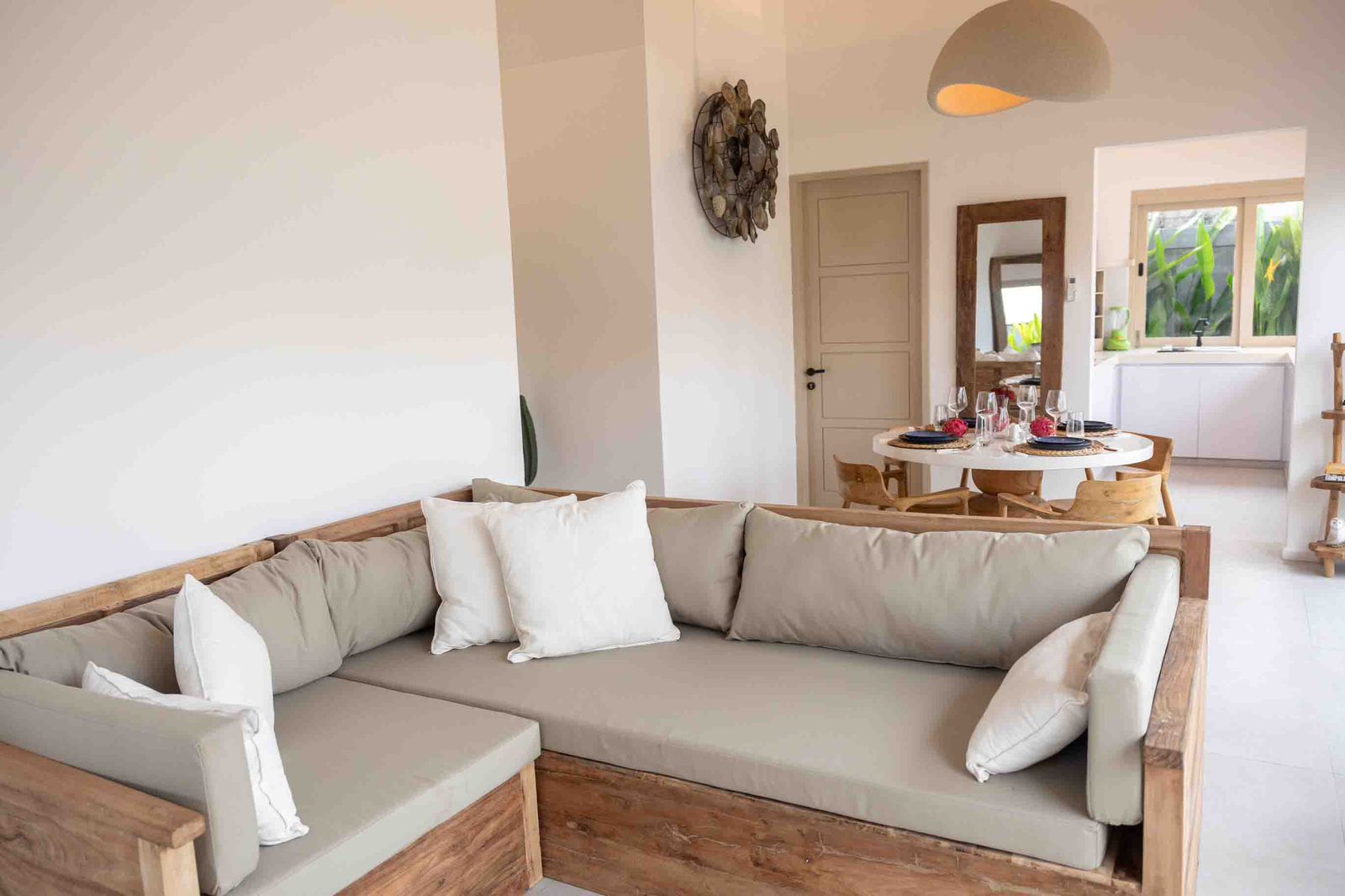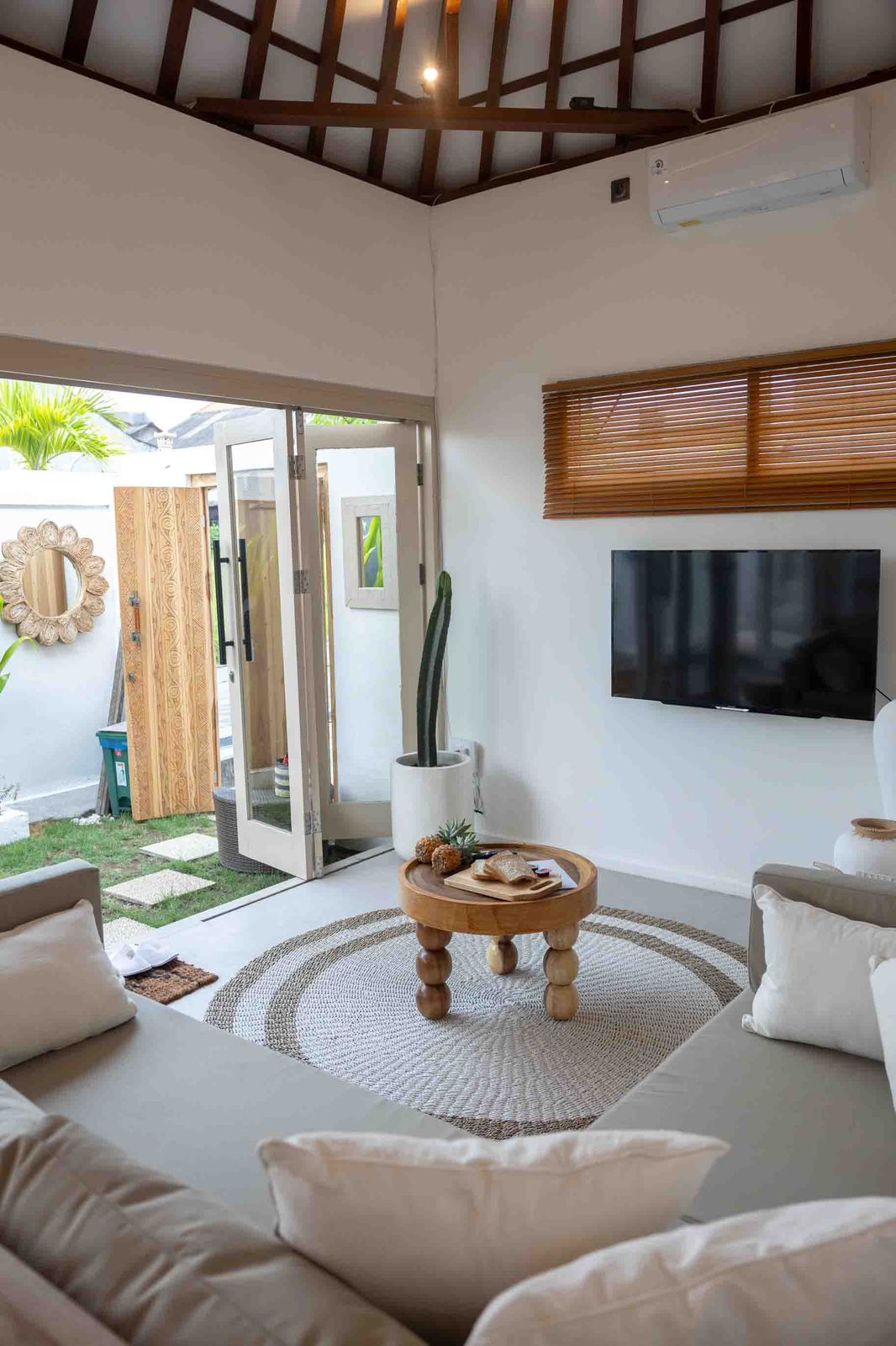 Villa Alain 1 features an enclosed living room, designed for comfort and convenience. Though not overly spacious, the layout feels cozy and intimate, perfect for small gatherings or simply relaxing after a day out in Canggu. A smart TV with Netflix access ensures you can enjoy your favorite shows and movies from the comfort of the sofa, while the adjoining compact dining space and fully equipped kitchen make staying in just as enjoyable as going out.