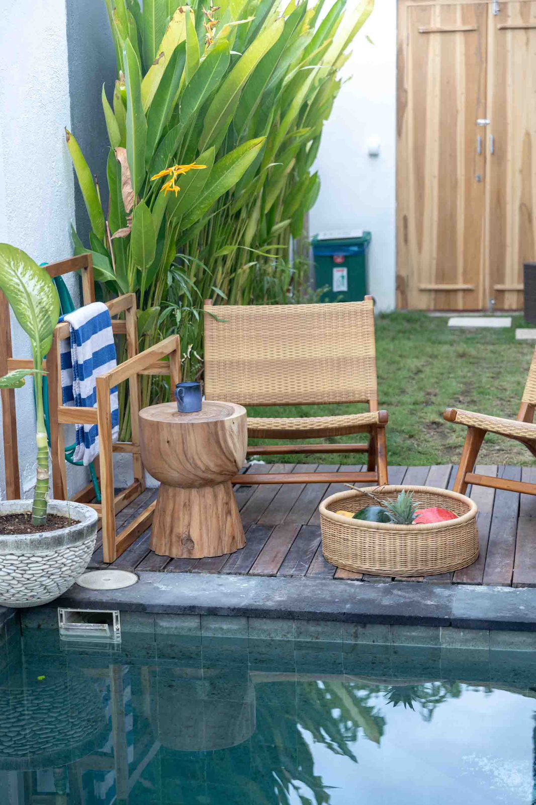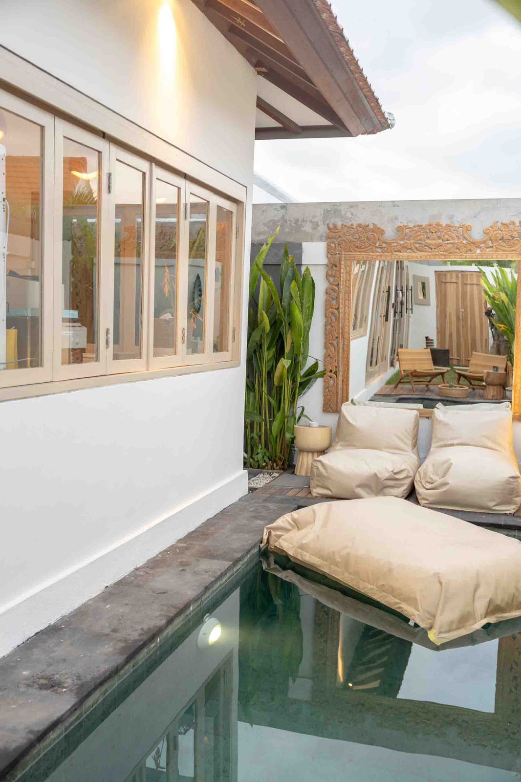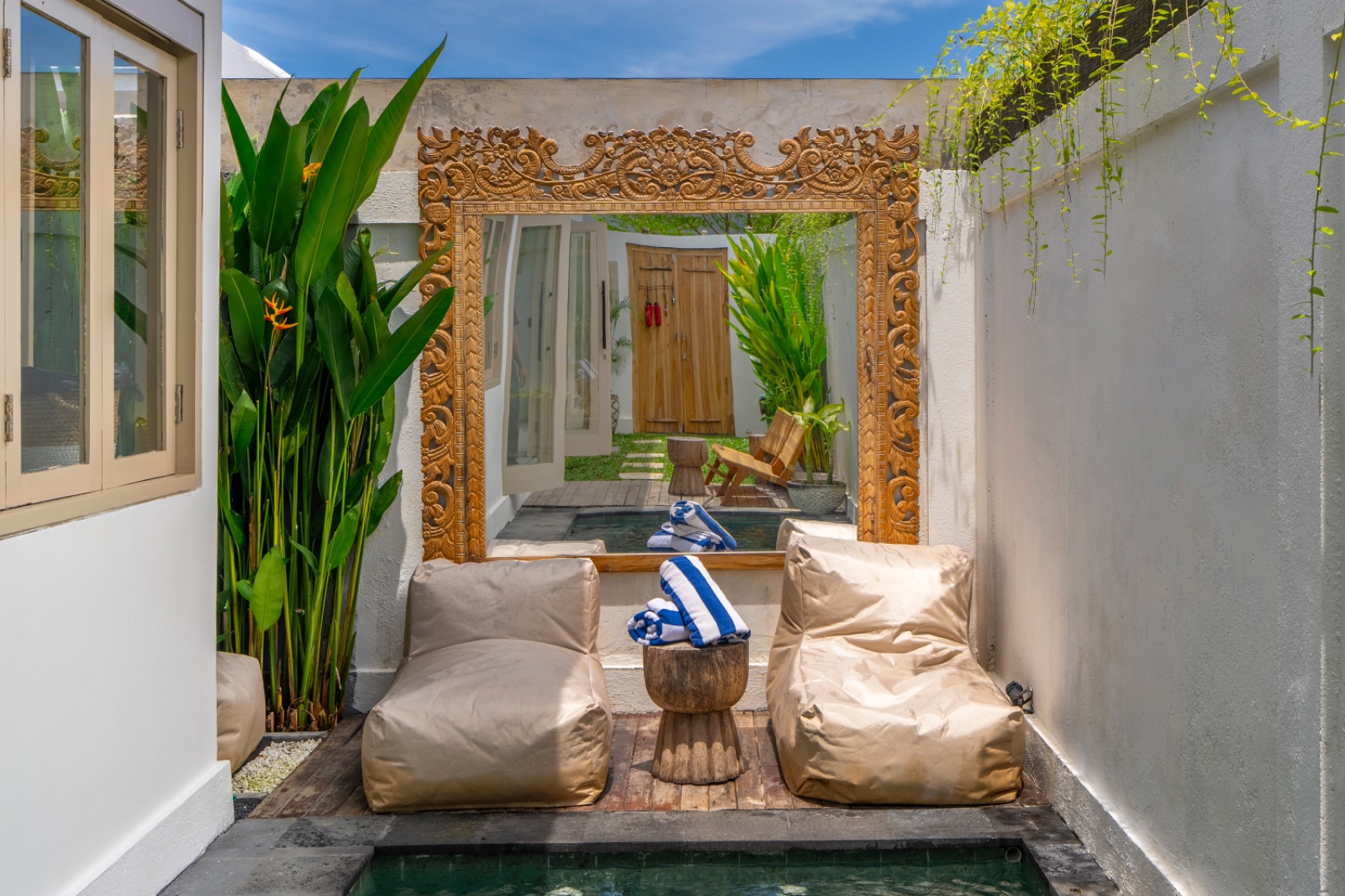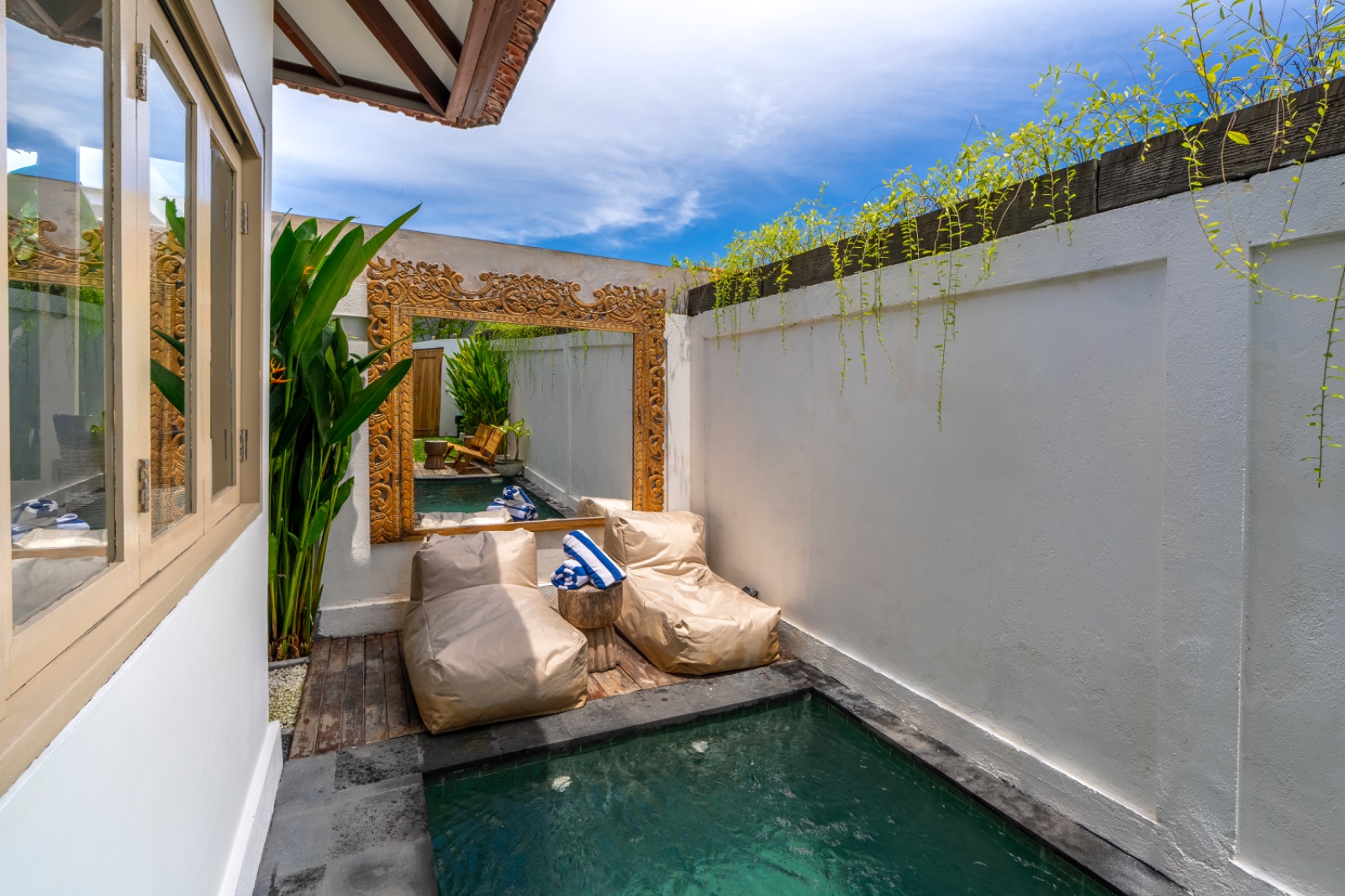 Outside, the villa boasts a private pool set amid a beautifully maintained garden, creating a serene spot to swim, sunbathe, or simply drift into relaxation. The pool area is complemented by comfortable seating and shade options, perfect for both sun-drenched lounging and shady respite as you enjoy Bali’s tropical warmth.