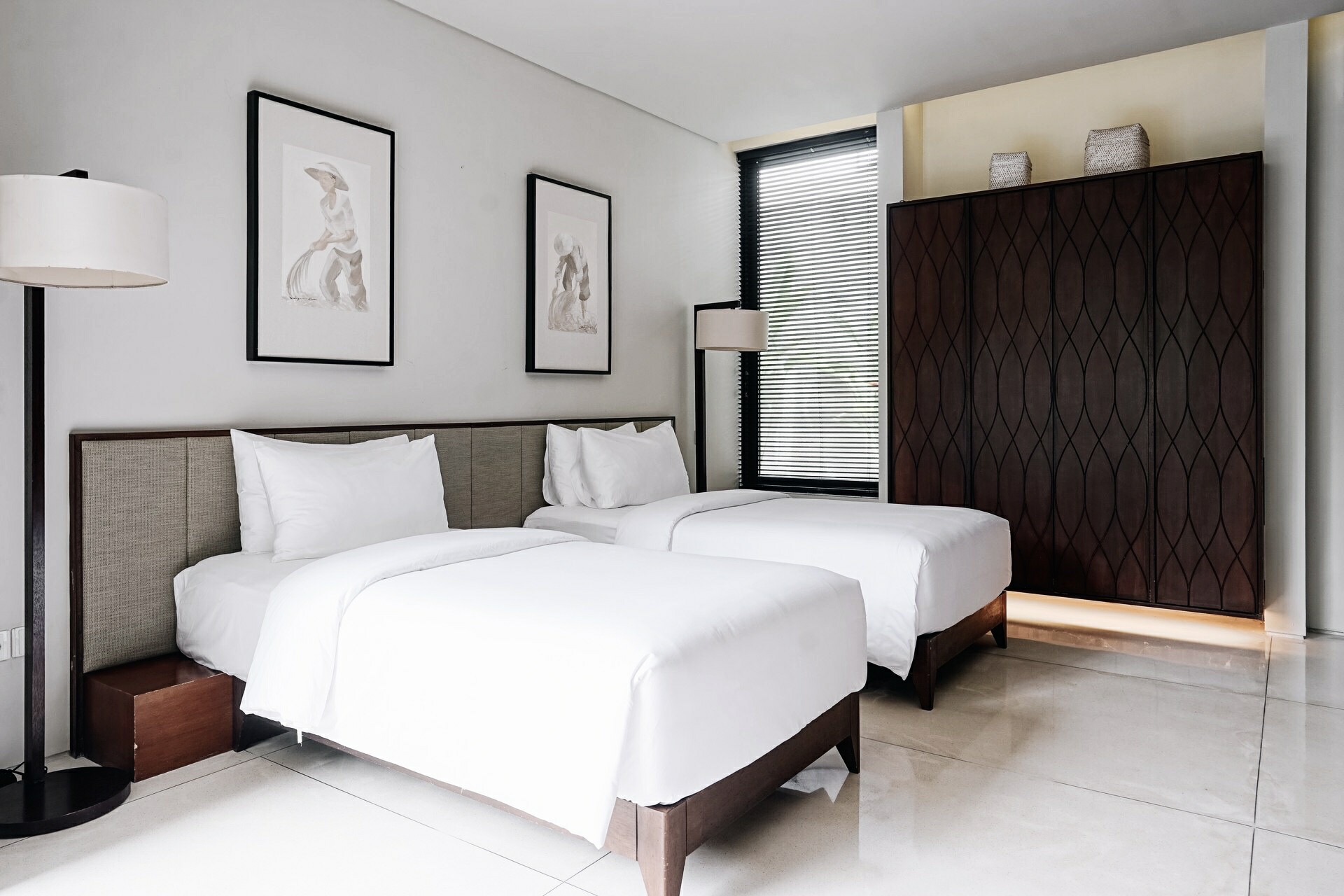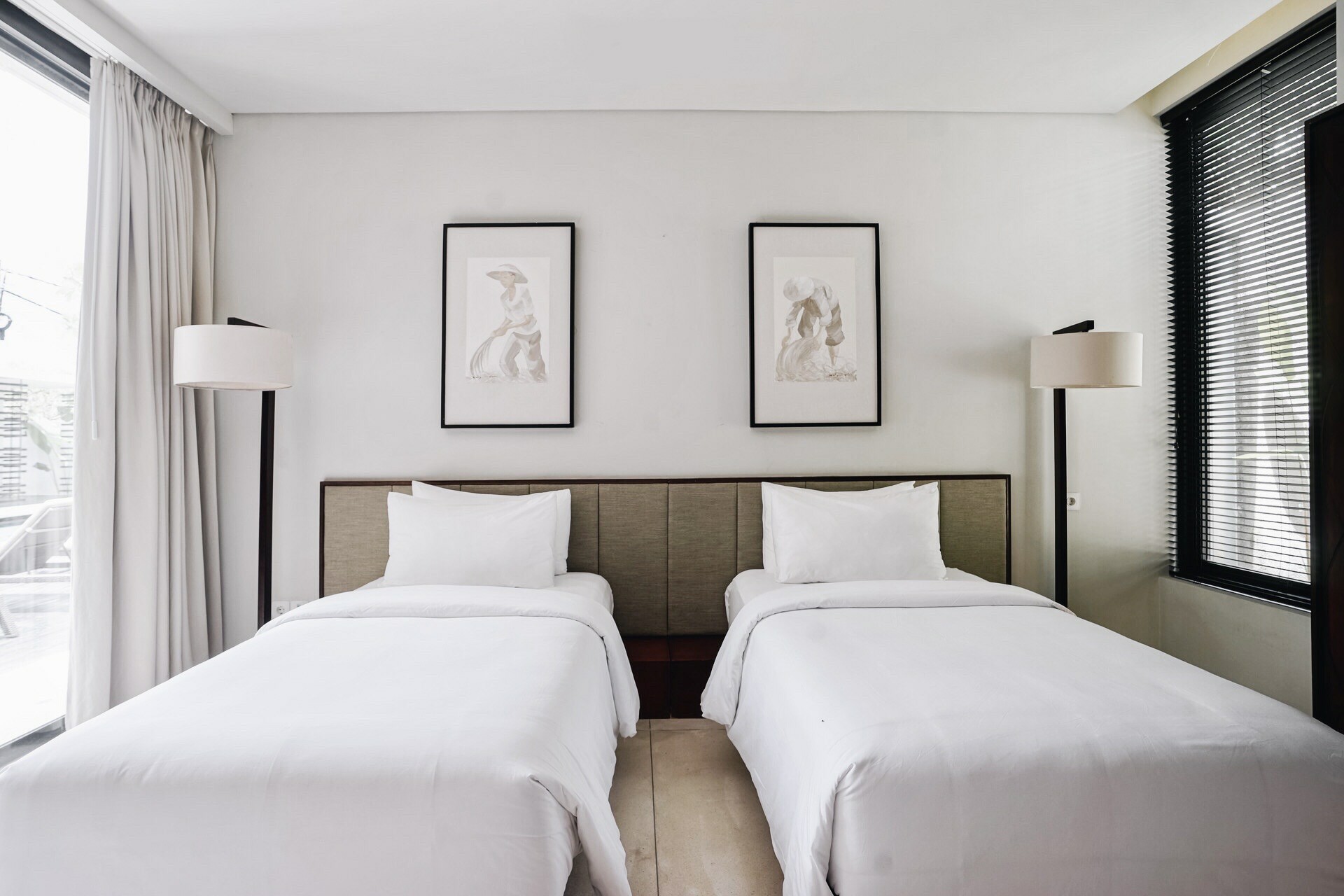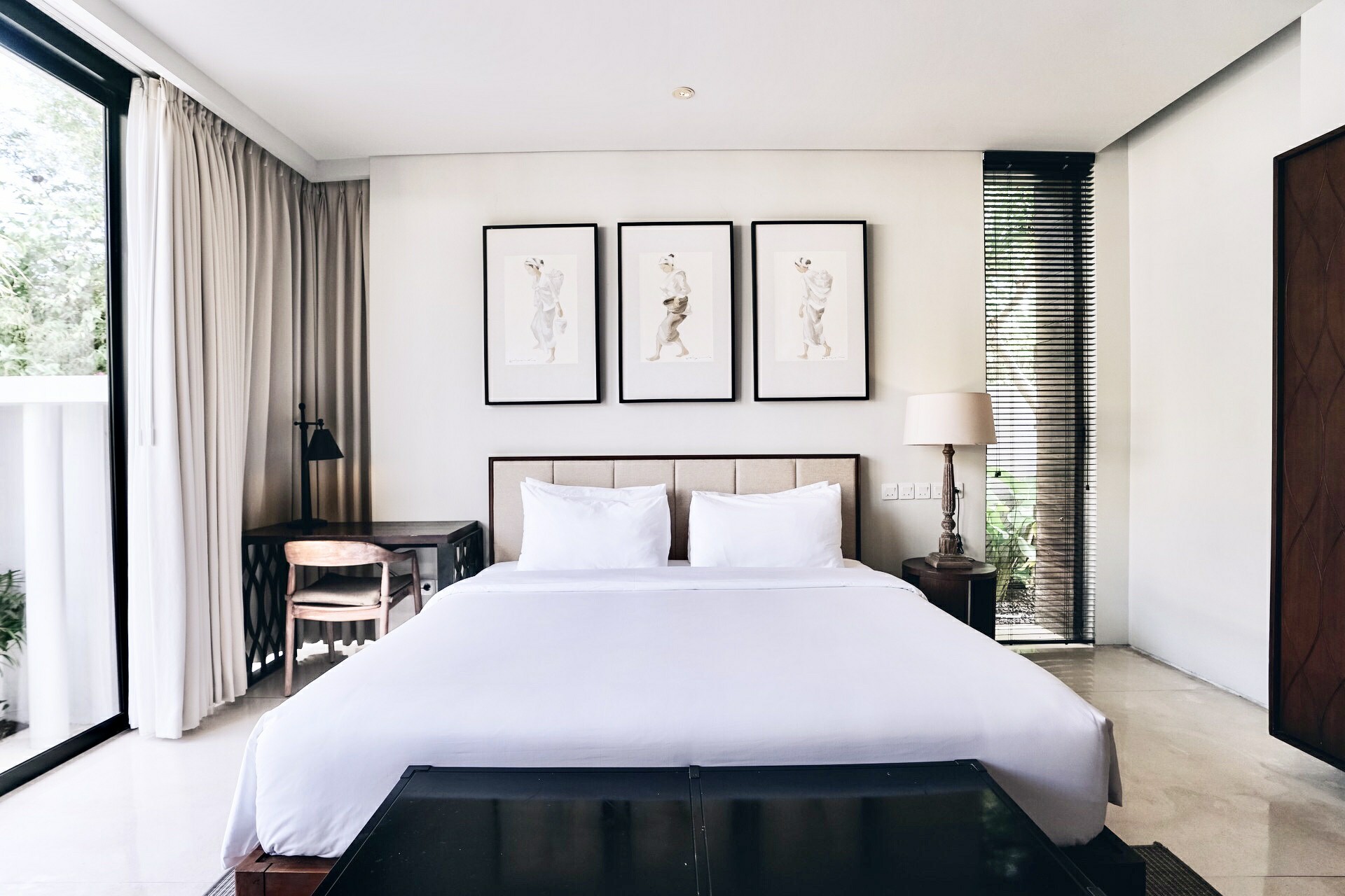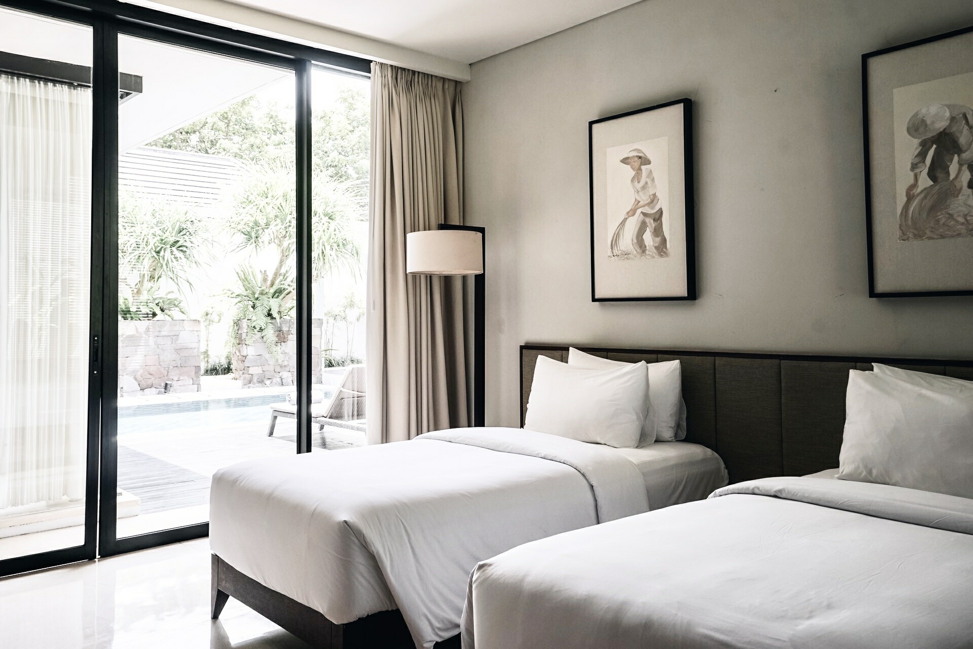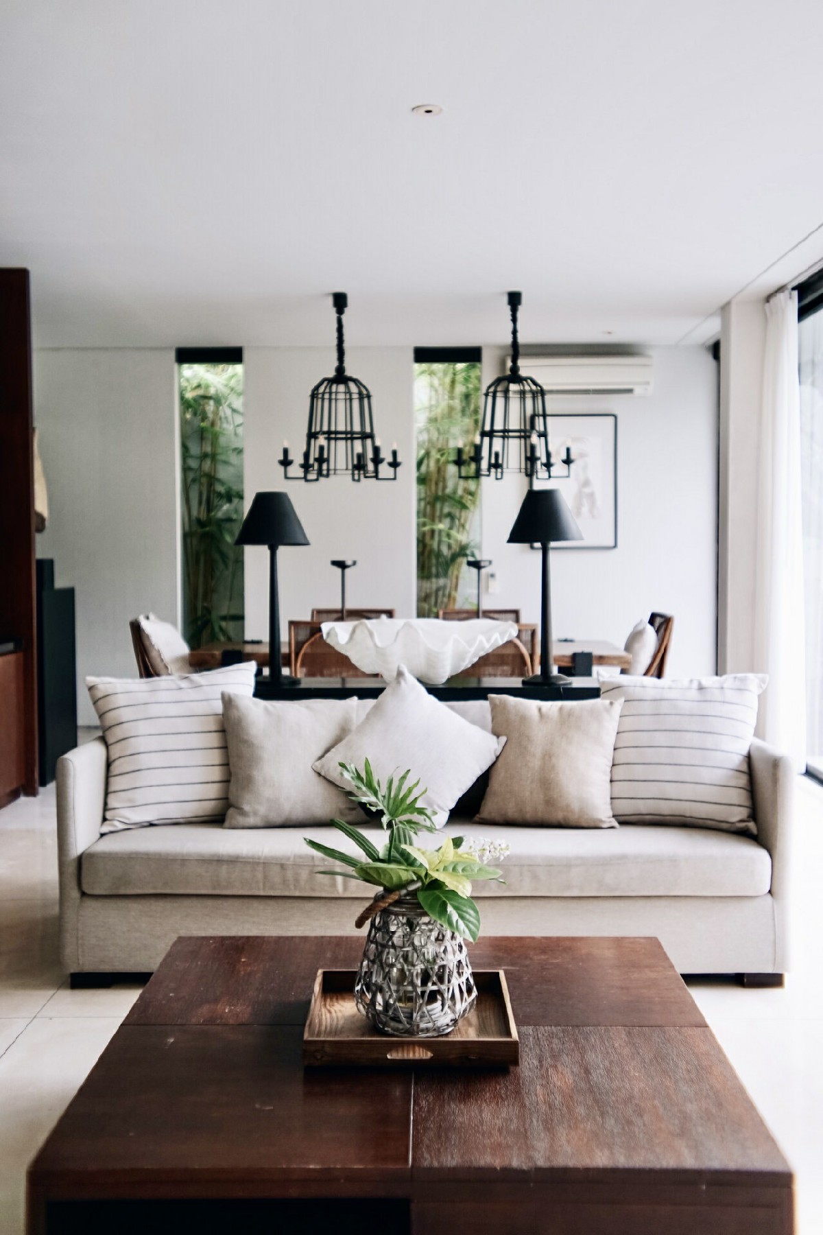 The master bedroom showcases a queen bed with a bathtub under a semi open-roof. The other two bedrooms are decked with a queen and a twin. All three bedrooms have an en-suite, large wardrobe and AC. Full-sized glass doors let in maximum daylight and open out directly to the lush pool garden area. The neutral colour scheme promotes a soothing backdrop, perfect for a restful night of sleep. All shower facilities are equipped with resort-style amenities.
