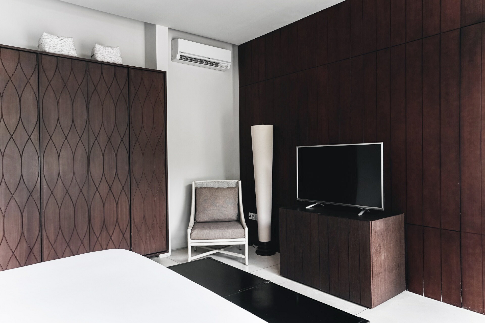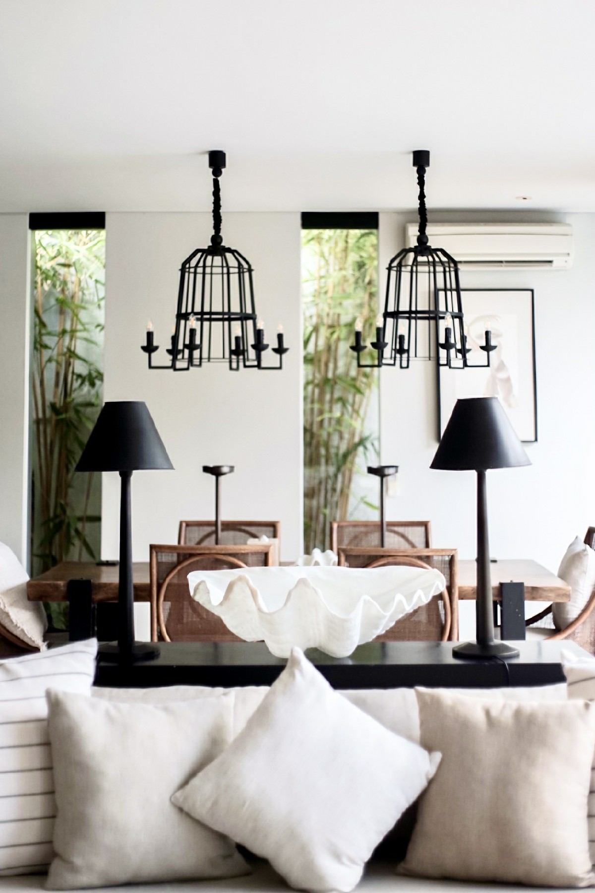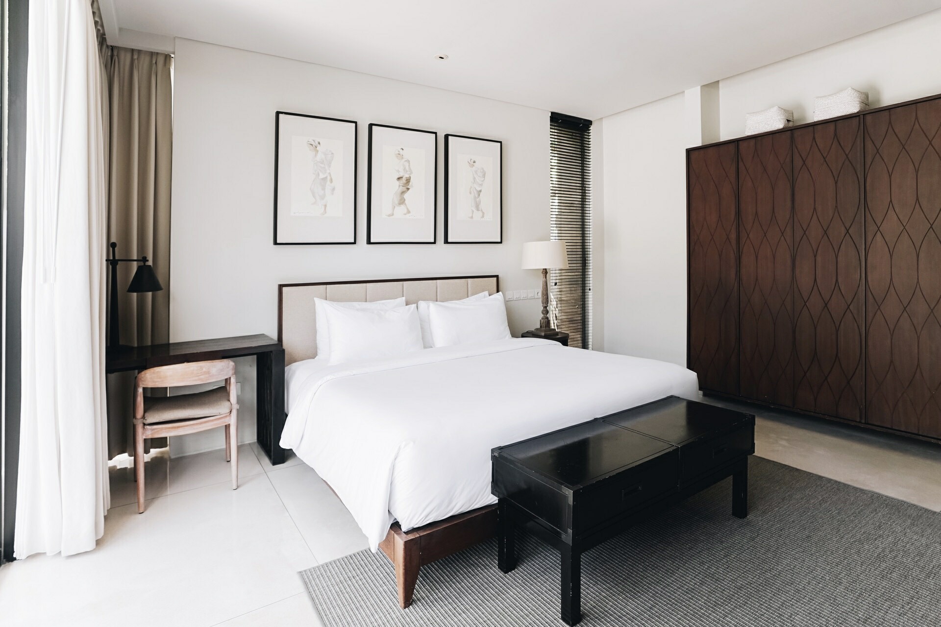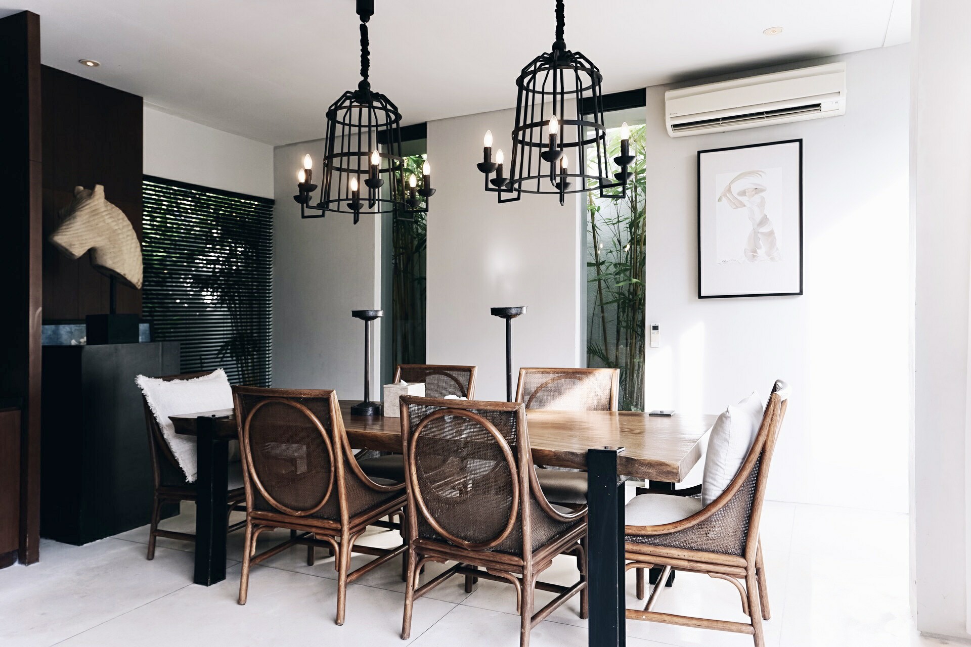 Effortless luxury awaits in every room of the villa. Where the pool ends, the elegant living room begins. These two spaces are barely separated by a floor-to-ceiling sliding glass door. You can plunge straight into the pool from the living room should you choose to. The snuggly lounge area invites you to chill while keeping yourself in the loop scrolling on social media. On the opposite end of the living room is the dining area. Interlinking these two areas is a modern kitchen which occupies an entire wall. Natural lights beam in from all corners of the room elevating the relaxing ambience of this space.