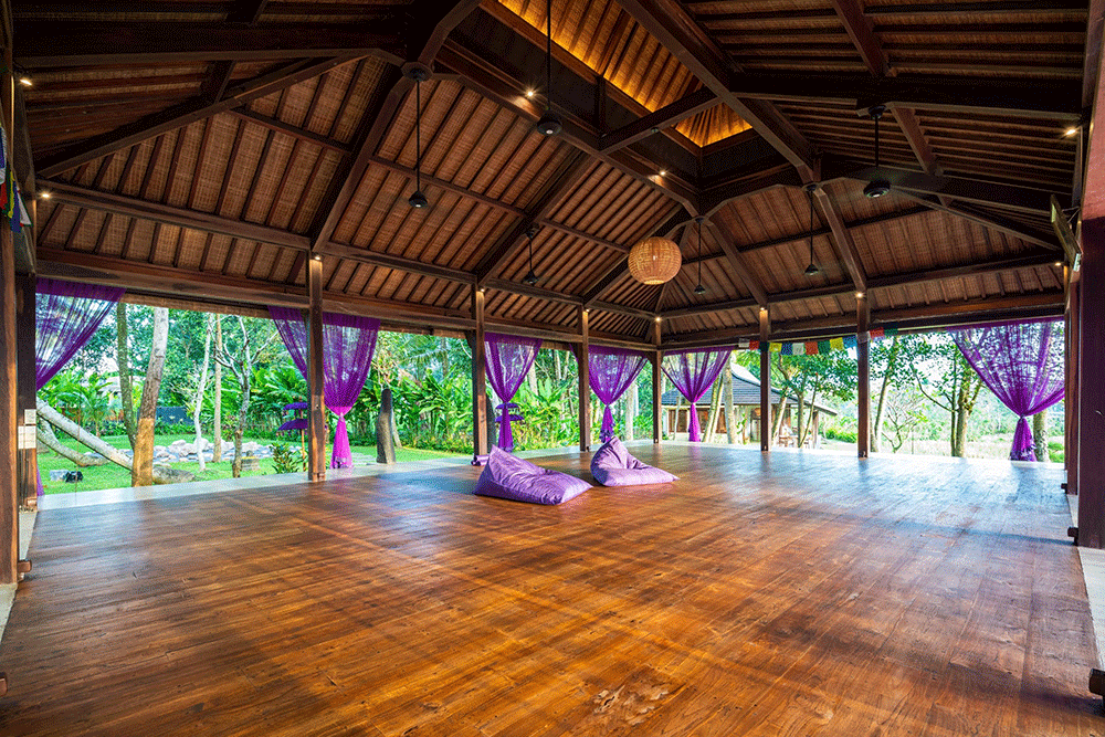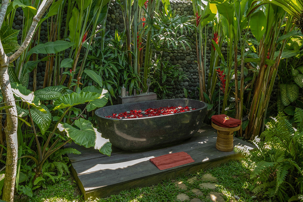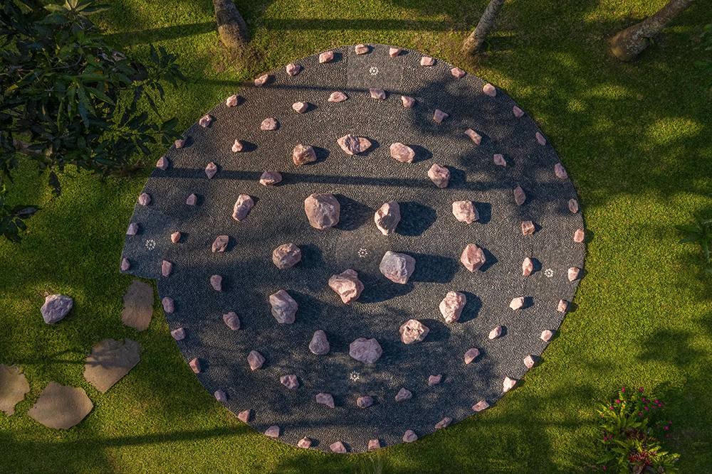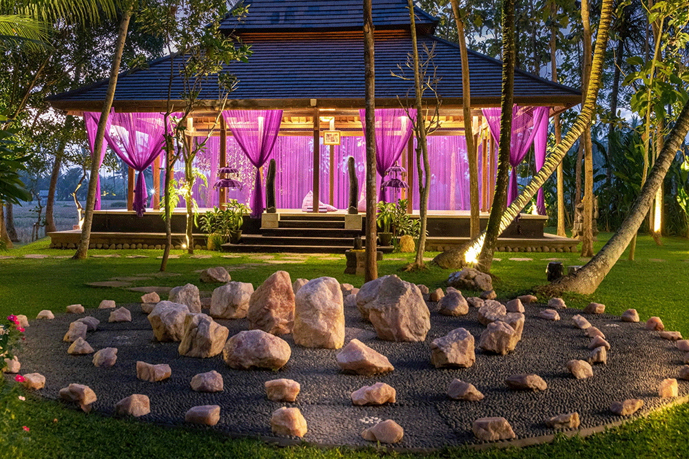 At Villa Crystal Castle, each day unfolds at its own pace, shaped by the easy rhythm of the serene setting. Stone pathways lead through tropical gardens to a wellness area where a rose quartz spiral anchors the space.