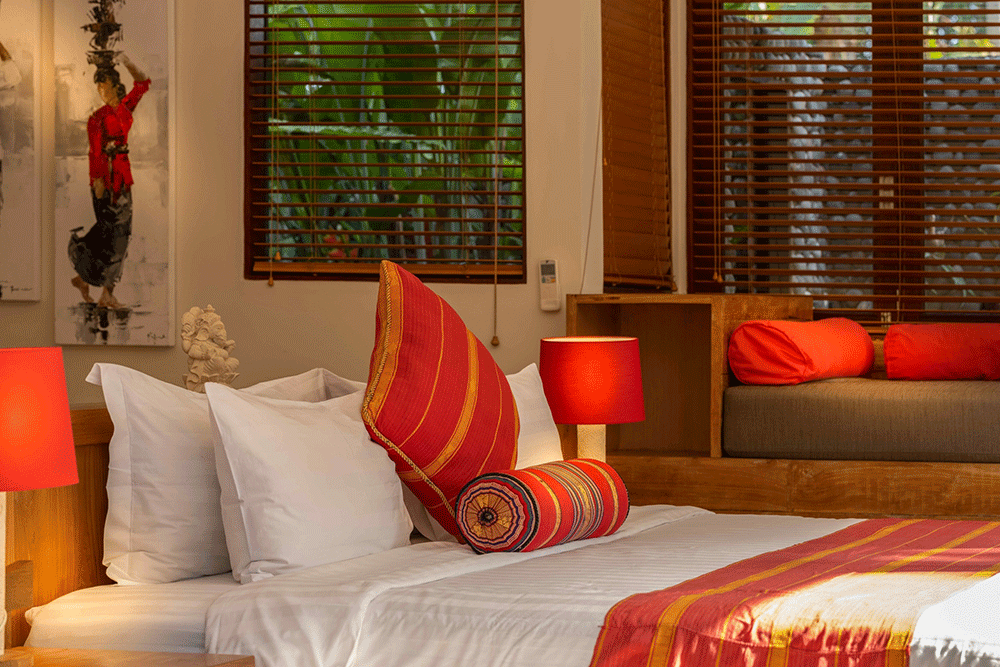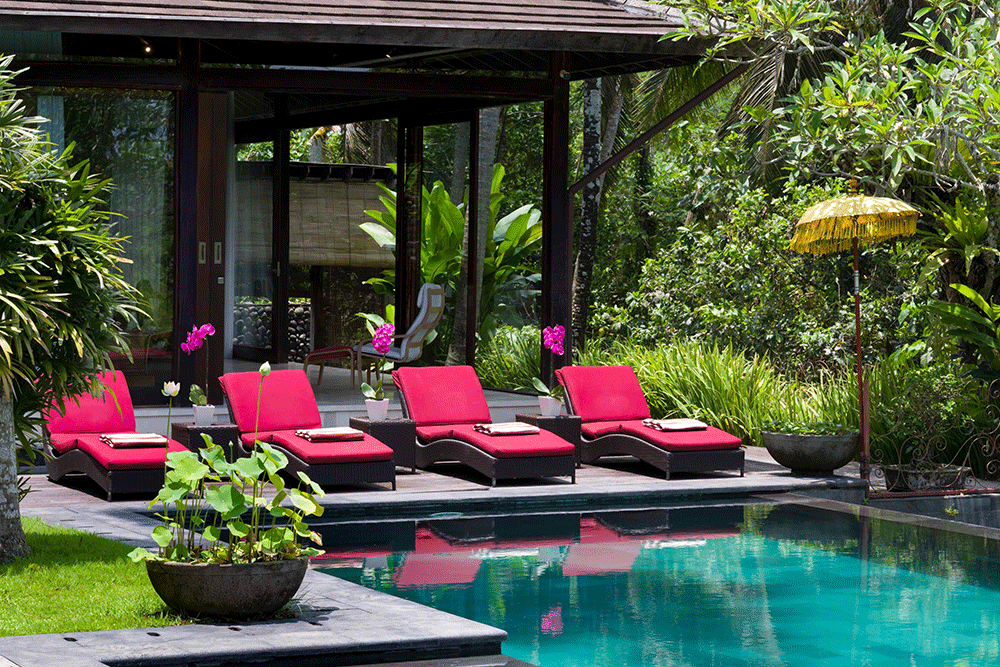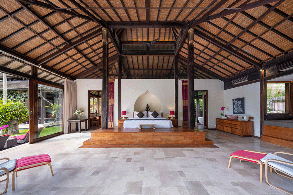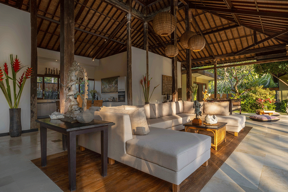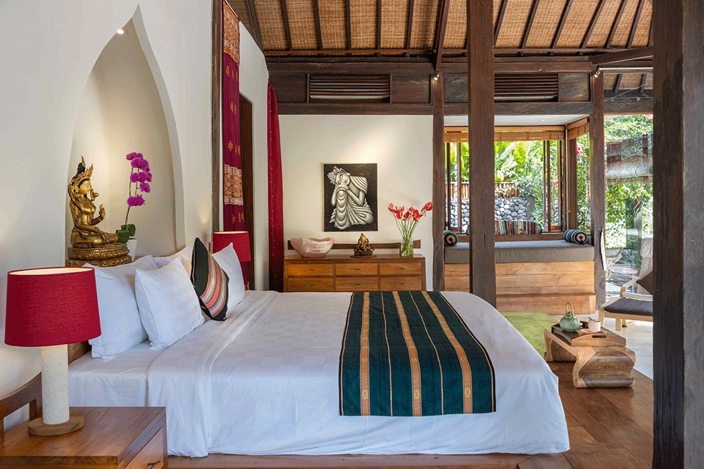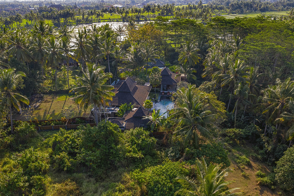 This wellness-minded property has seven bedrooms, accommodating up to 14 guests, along with wellness facilities that include a private pool, yoga shala, spa, and a rose quartz reflexology path. Located on a 4,600 sqm site, the villa is designed around an expansive open-air living area, where deep sofas invite conversation and connection. From here, guests can look out across the pool to layers of vibrant jungle or sit in the private yoga shala and gaze across a rice field that shifts in colour and texture with the seasons.