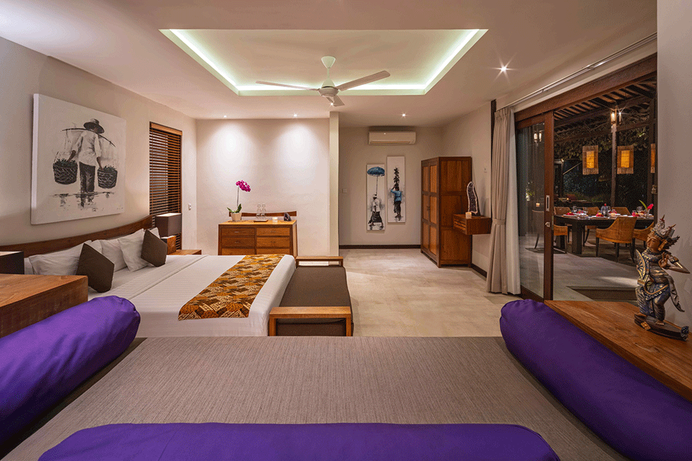 Every room has its own character, furnished with teak furniture and rare crystals that give the villa its name. Two suites are housed in individual private bungalows, each with a kitchenette overlooking the rice fields. Each area opens easily to the others, creating a calm setting that feels both refined and rooted in its surroundings.