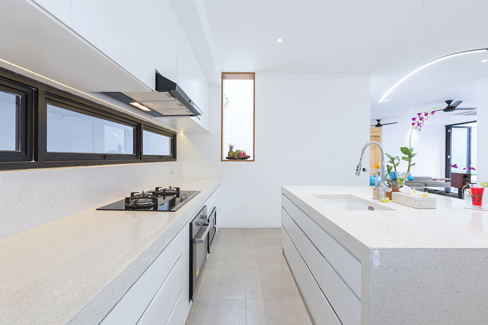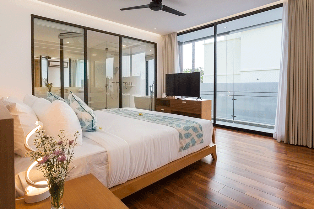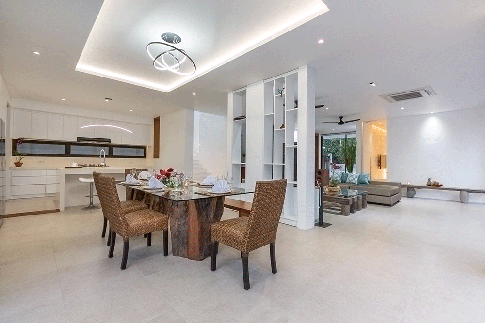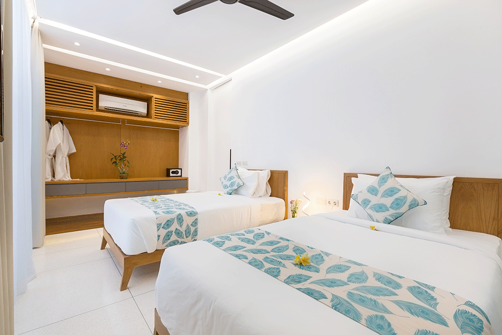 Villa Damar Canggu’s design is simple, yet modern with transparent roof on the stairs, lighting your way up to the second floor. Have the perfect night sleep on its spacious 4 (four) bedrooms, with a guest bedroom located on the first floor, and the other three on the second floor. All bedrooms are in minimalist design, proving that ‘less is more’ concept is truly the best for a luxury rest. There is no unnecessary display, so the quality of sleep can be assured. The master bedroom and the other two guest room on the second floor are all equipped with ensuite bathroom, smart TVs with International channels, comfortable king size bed in the master and twin beds on the guests bedrooms and enough natural light in the morning. Inside the master bedroom, have a warm and relaxing dip into our Jacuzzi, for a luxury feel of easing in the afternoon.