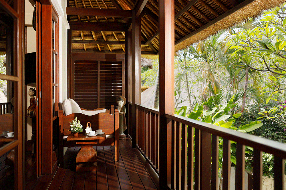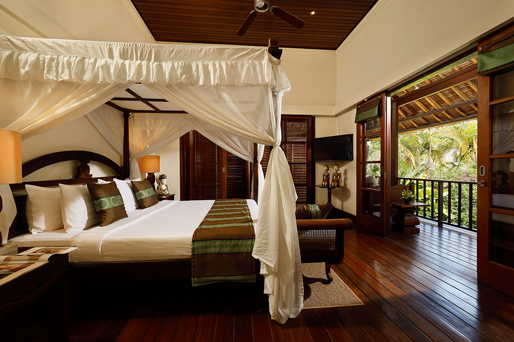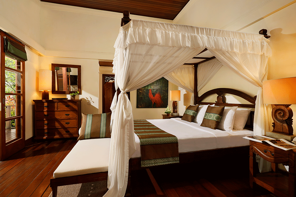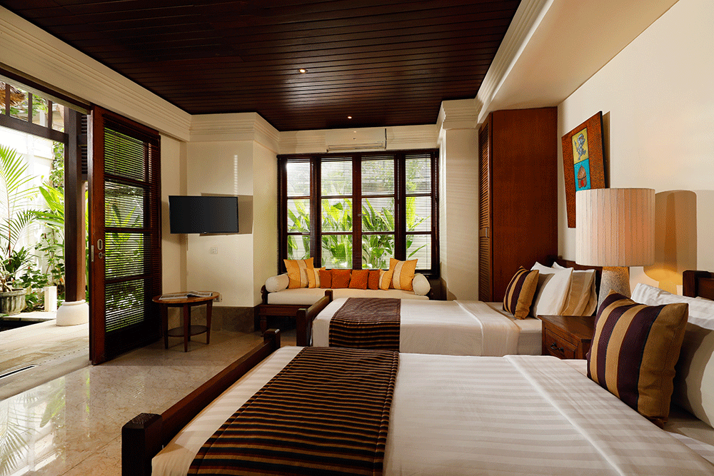 All three bedrooms occupying a two-story pavilion exude maximum comfort and effortless luxury. Taking up the entire top floor, the palatial master bedroom features a four-poster king bed as well as two additional rooms. The adjacent spacious room sees an oversized white marble bathtub sitting opposite an extended wash basin, with the shower facilities located in the far end room. An extended L-shaped balcony overlooks the pool garden and its luscious surroundings. The two bedrooms located on the ground floor boast a queen bed in one and a twin bed in the other. Both have en-suite bathrooms and open out to a garden area near the pool. All bathrooms are equipped with luxury resort-style amenities.