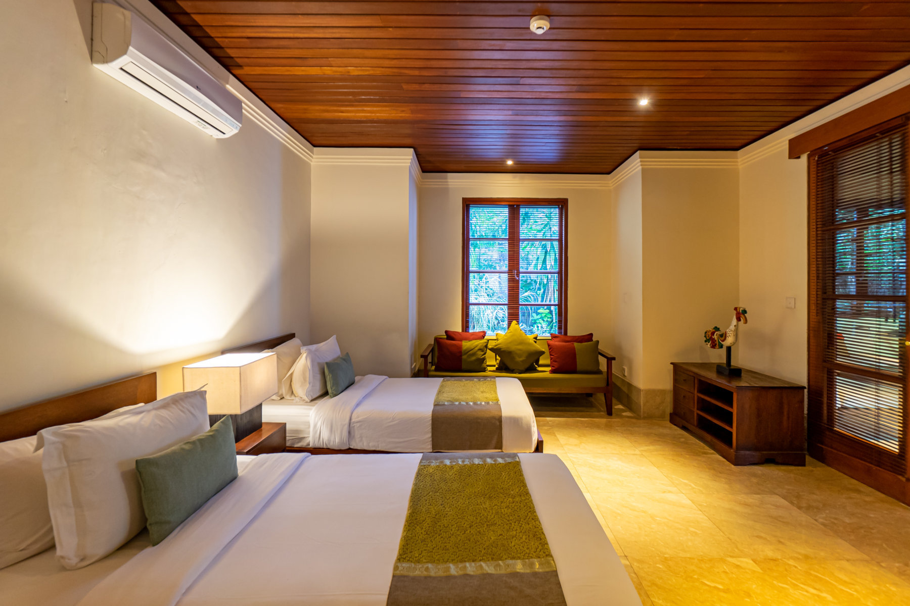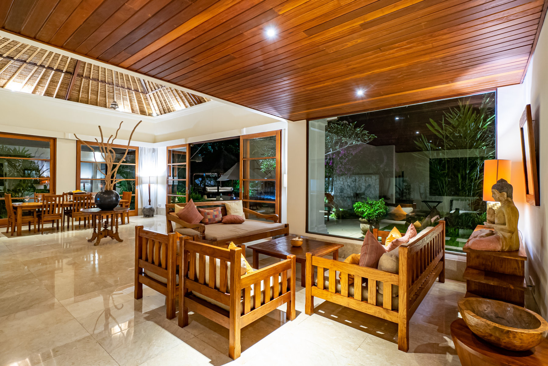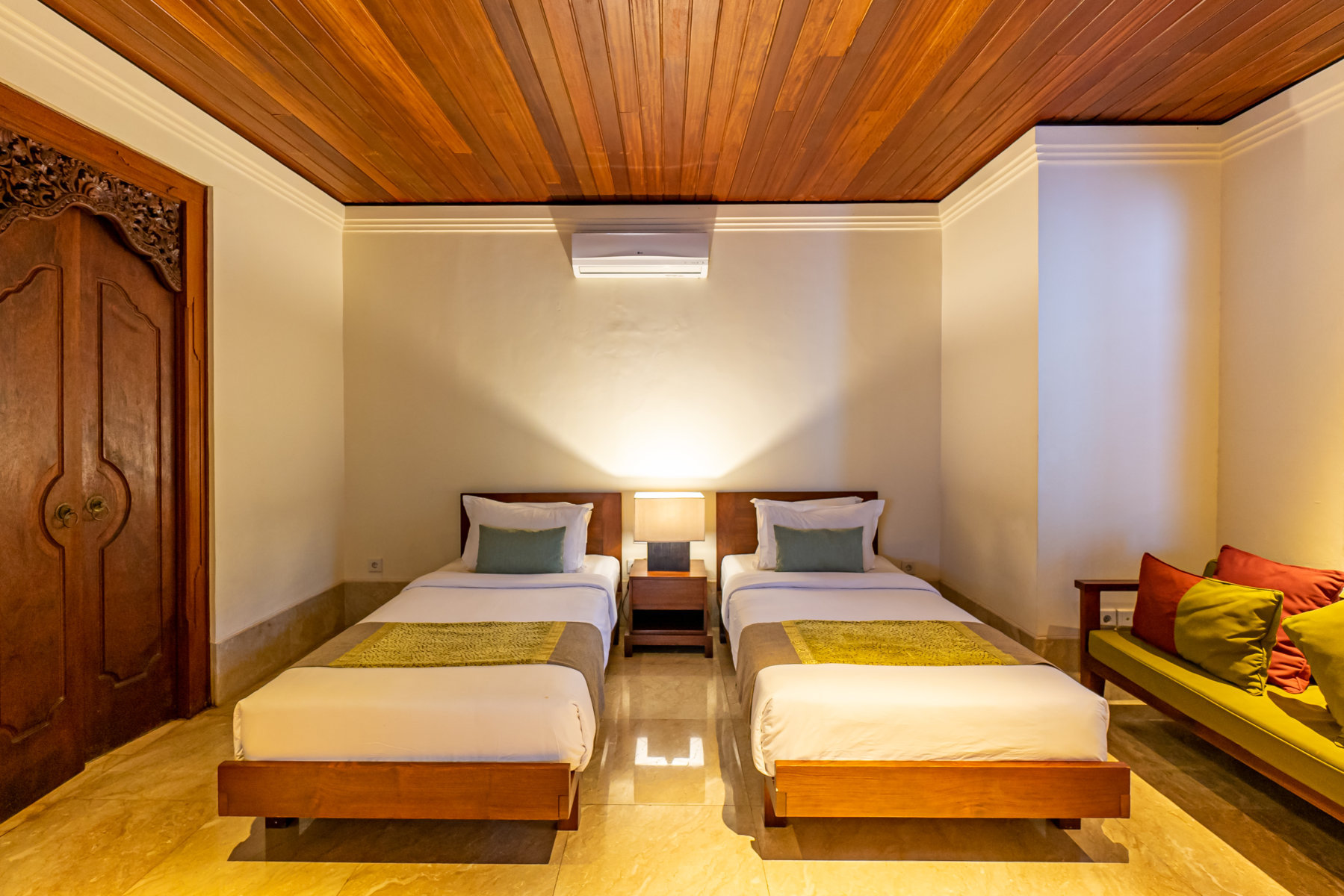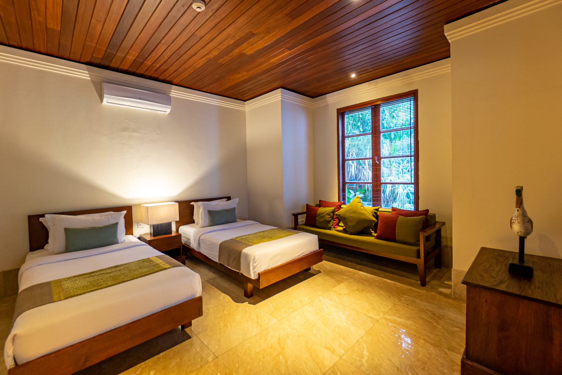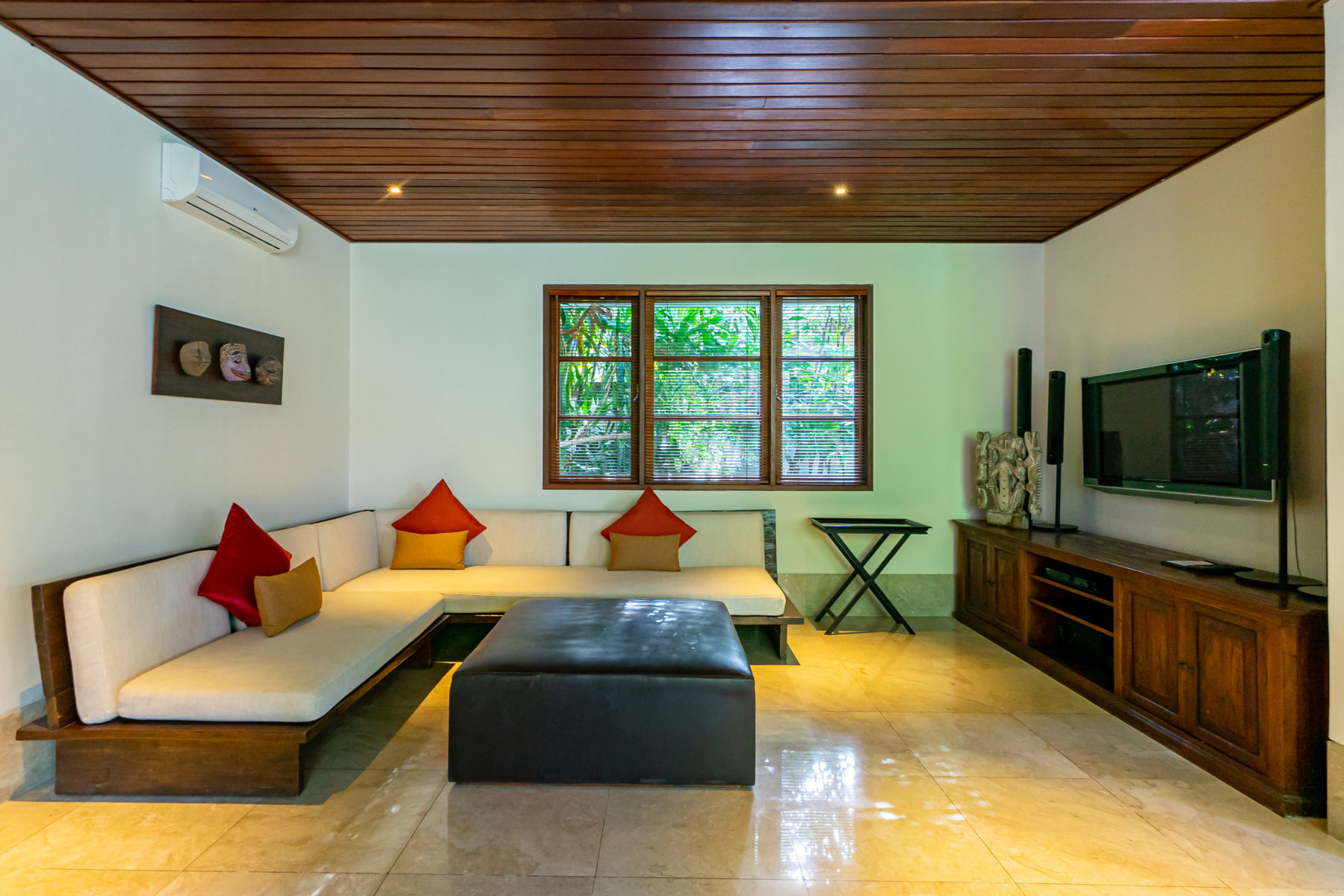 Each of the bedrooms has double beds, TV, Air Conditioner and is located at great proximity to ensure full privacy. All with en-suite and large timber wardrobe closets, two of the bathrooms on the ground floor open out to the outdoor garden area and the other to an outdoor jacuzzi. The master bedroom on the top floor epitomises luxury living with separate room for jacuzzi and showers respectively, and a balcony overlooking the verdant garden below. The interior décor combines to perfection modern comfort with traditional Balinese edge with ample of natural light.