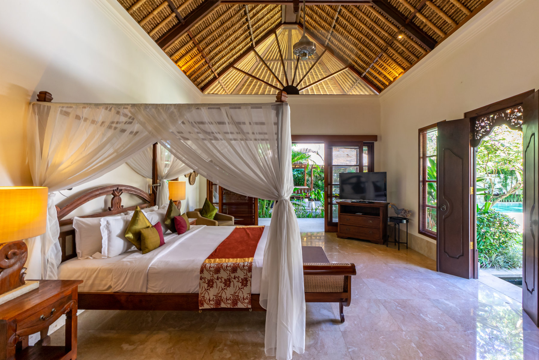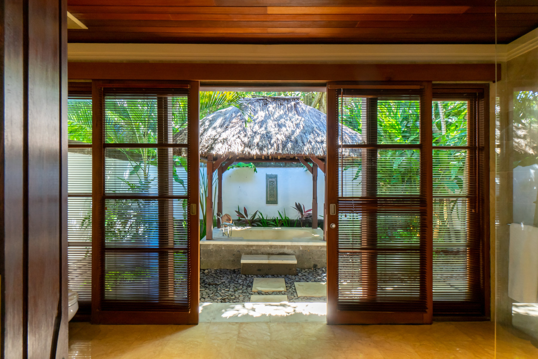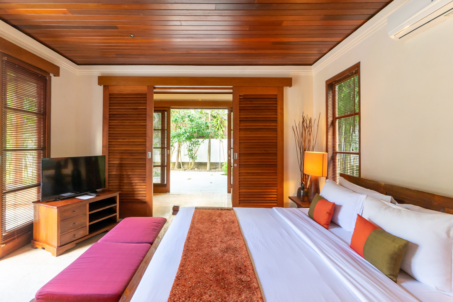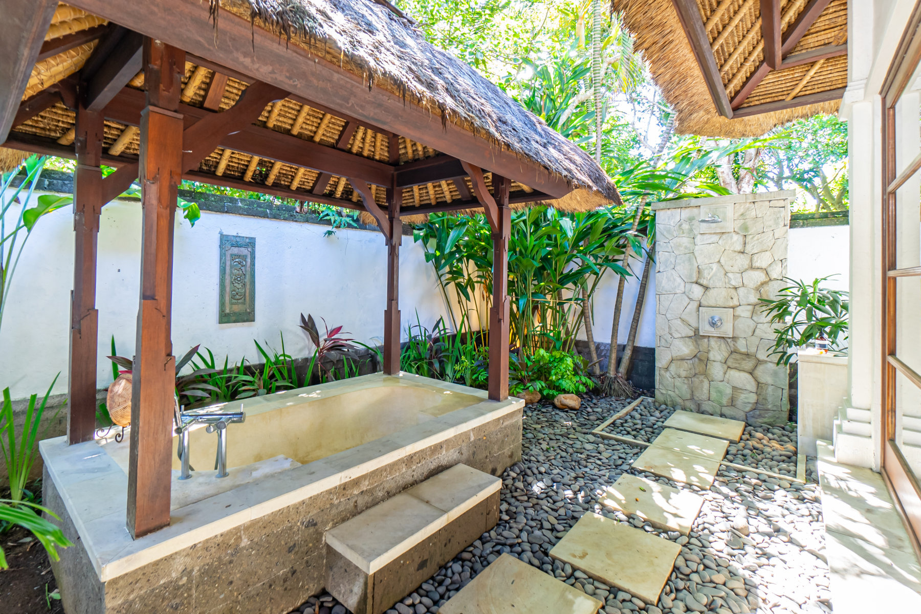 Each of the bedrooms has double beds, TV, Air Conditioner and is located at great proximity to ensure full privacy. All with en-suite and large timber wardrobe closets, two of the bathrooms on the ground floor open out to the outdoor garden area and the other to an outdoor jacuzzi. The master bedroom on the top floor epitomises luxury living with separate room for jacuzzi and showers respectively, and a balcony overlooking the verdant garden below. The interior décor combines to perfection modern comfort with traditional Balinese edge with ample of natural light.