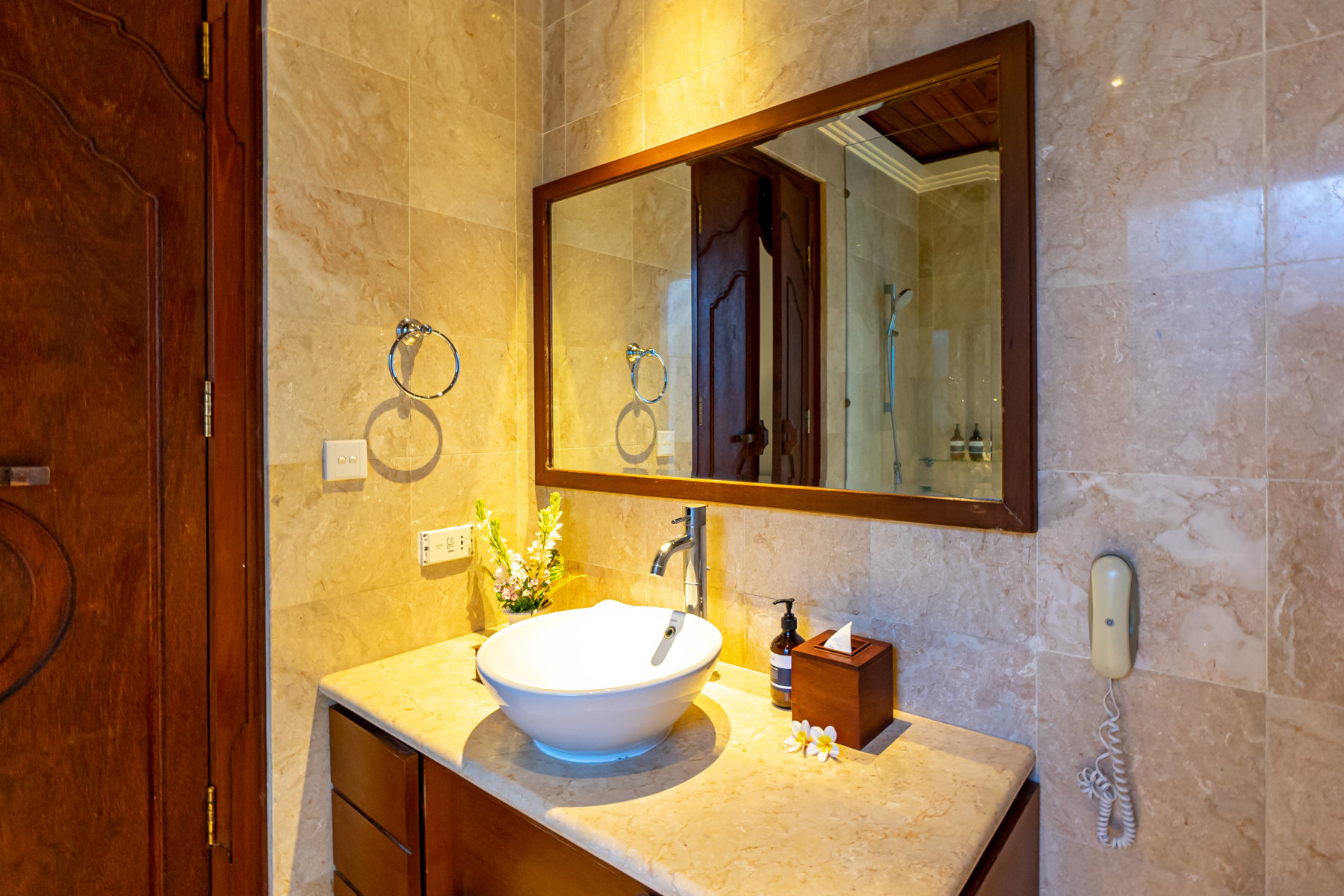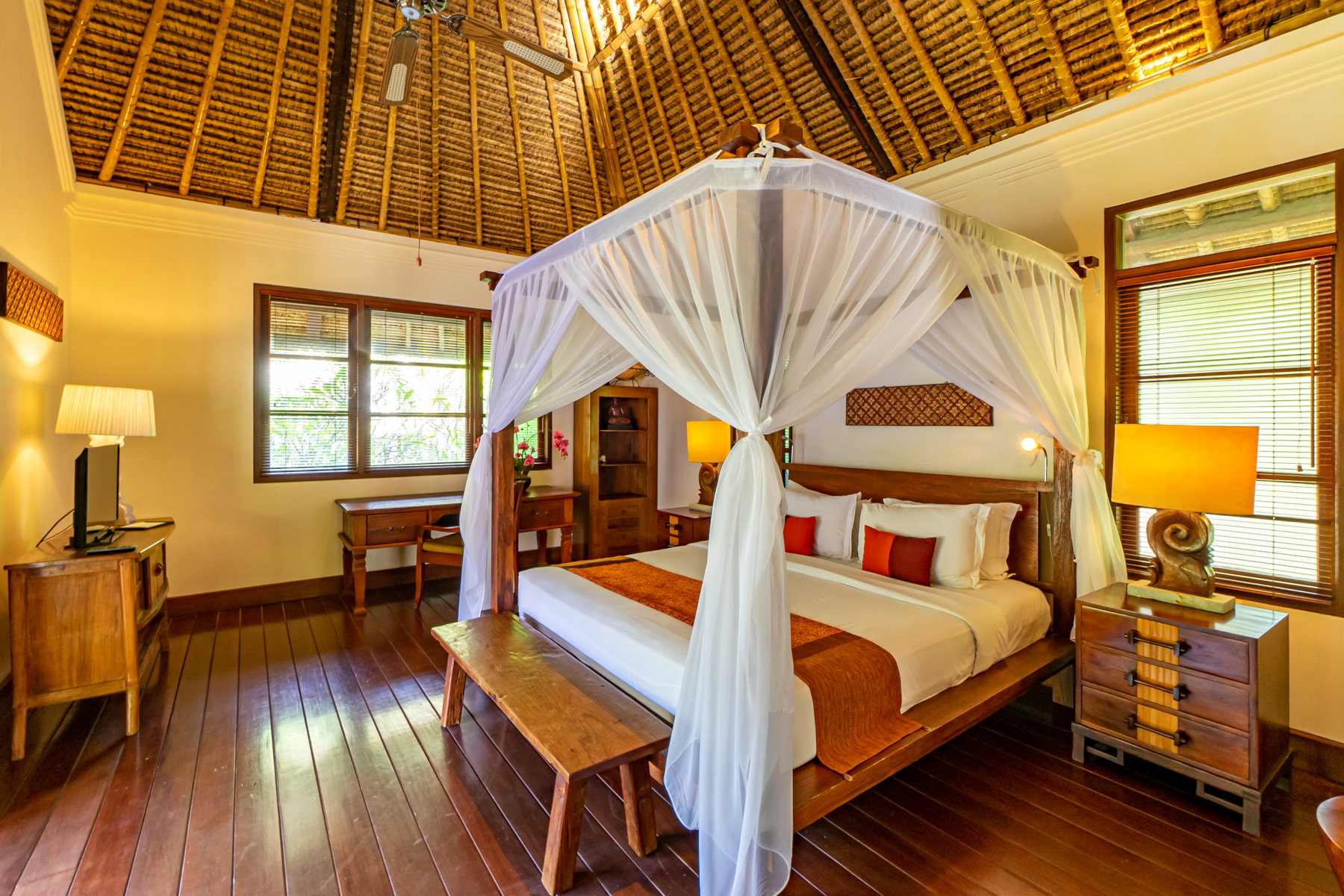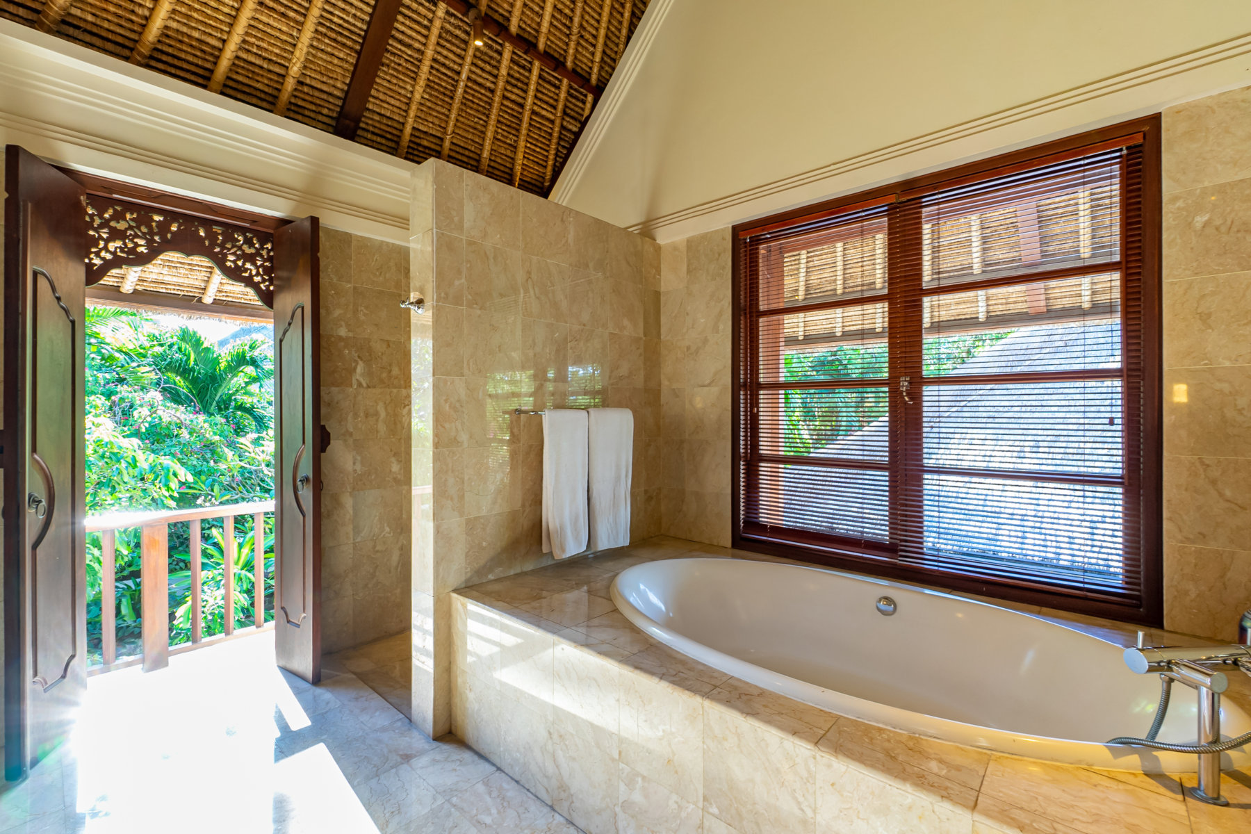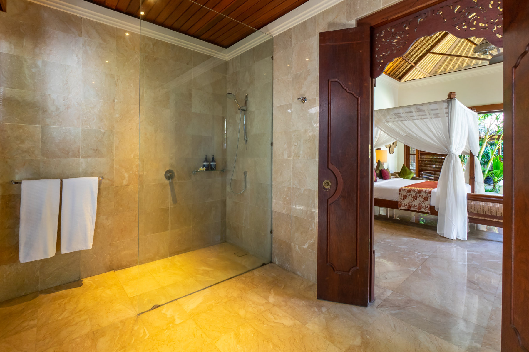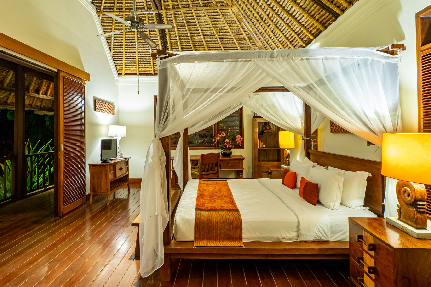 Each of the bedrooms has double beds, TV, Air Conditioner and is located at great proximity to ensure full privacy. All with en-suite and large timber wardrobe closets, two of the bathrooms on the ground floor open out to the outdoor garden area and the other to an outdoor jacuzzi. The master bedroom on the top floor epitomises luxury living with separate room for jacuzzi and showers respectively, and a balcony overlooking the verdant garden below. The interior décor combines to perfection modern comfort with traditional Balinese edge with ample of natural light.