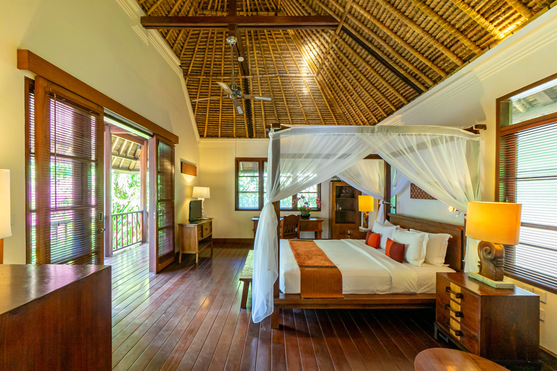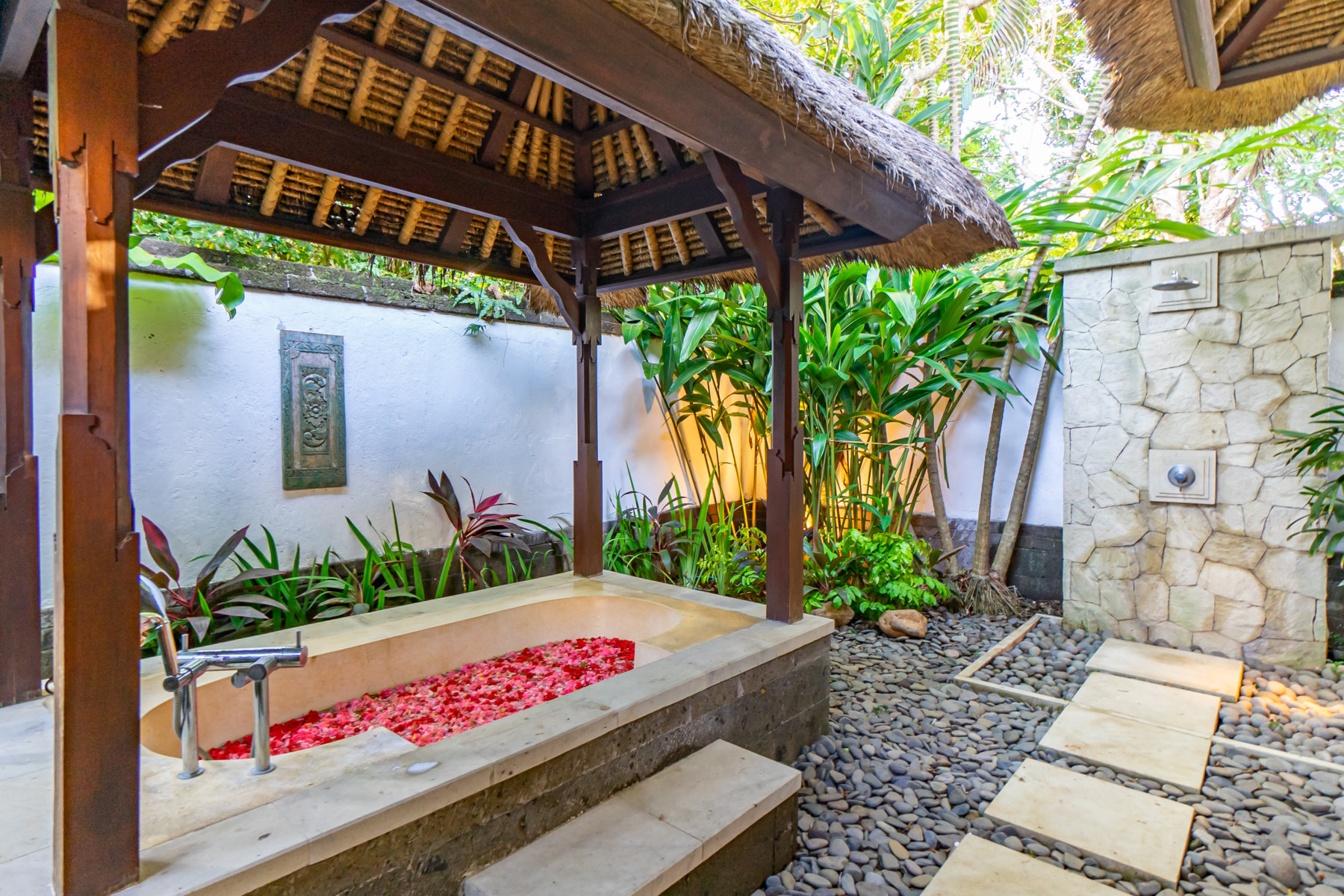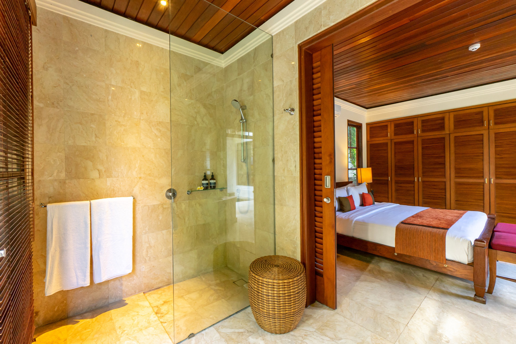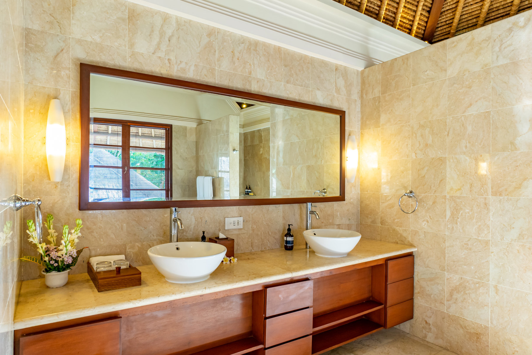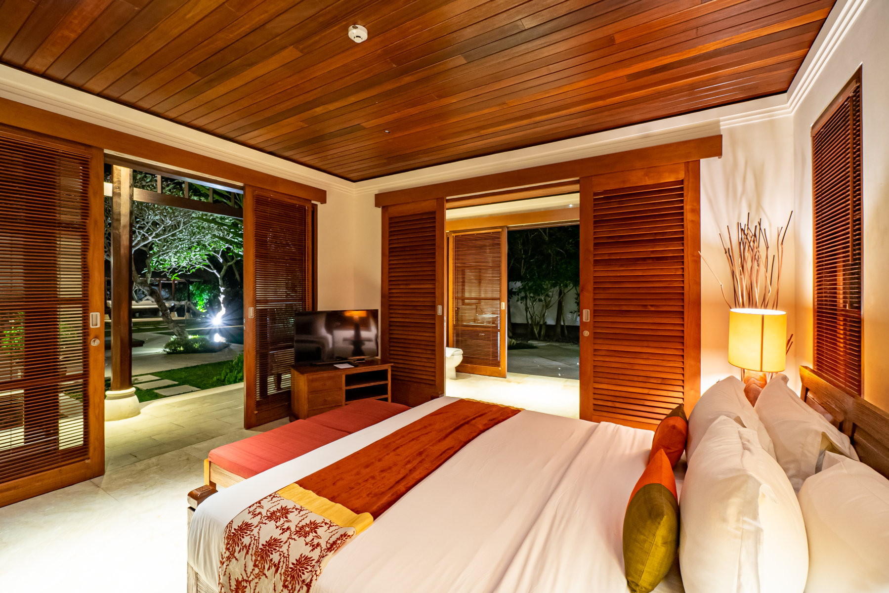 Each of the bedrooms has double beds, TV, Air Conditioner and is located at great proximity to ensure full privacy. All with en-suite and large timber wardrobe closets, two of the bathrooms on the ground floor open out to the outdoor garden area and the other to an outdoor jacuzzi. The master bedroom on the top floor epitomises luxury living with separate room for jacuzzi and showers respectively, and a balcony overlooking the verdant garden below. The interior décor combines to perfection modern comfort with traditional Balinese edge with ample of natural light.
