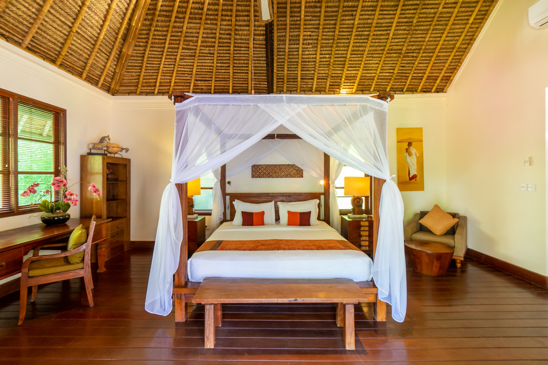 The living room is opulent with the full view of the exuberant garden and a high traditional thatched roof with wall-to-wall floor-to-ceiling glass doors and windows to ensure plenty of natural light flowing into the living spaces. Sophisticated furniture with exquisite furnishings ooze the best of modern luxury living at the turn of every corner. The oversized kitchen occupying the whole length of a wall complete with walk-in pantry and facilities is designed to cater for large parties or celebrations. The area for dining adjacent to the kitchen is grand. There are two lounge areas separated by a semi-wall, ideal suitable for different groups to hang out. Of course, the living room opens out into the garden area.