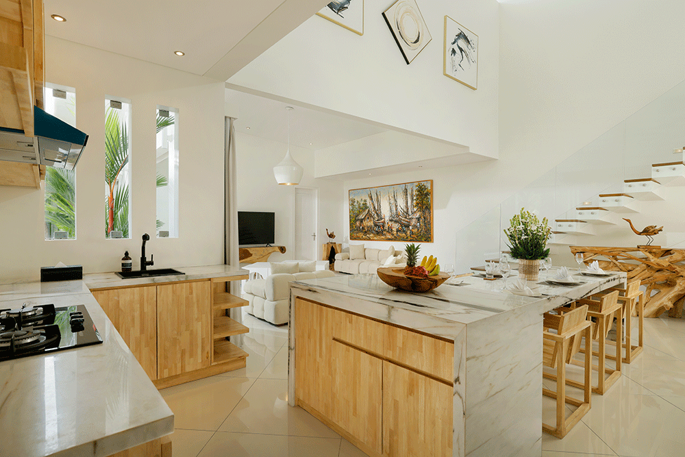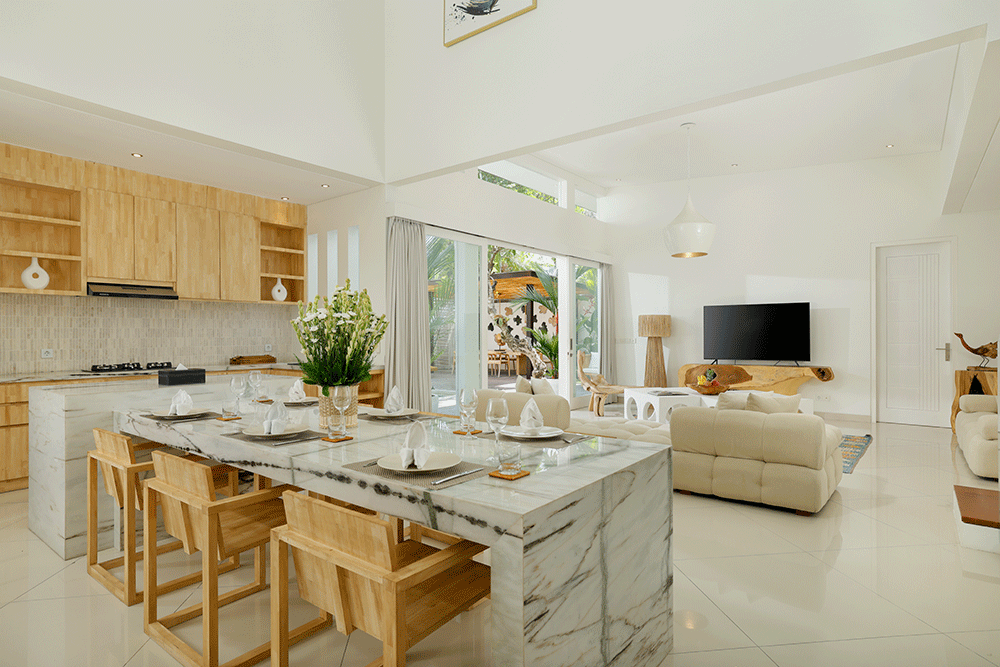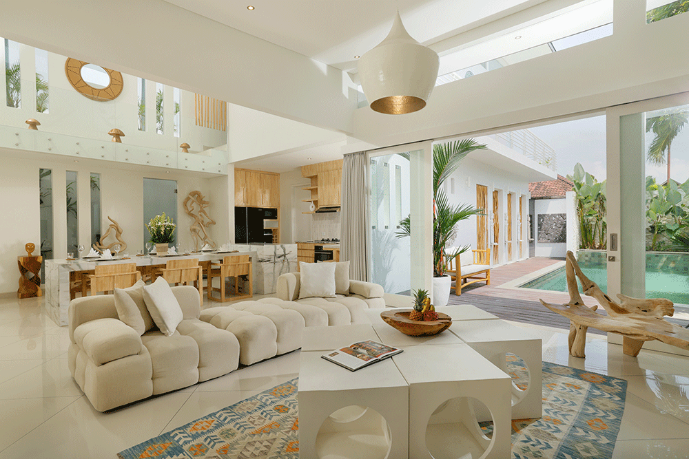 The villa’s open design maximizes both light and space, creating an environment of simplicity and calm. The spacious living area flows seamlessly into the outdoor pool and garden, allowing guests to fully embrace Bali’s natural beauty. The comfortable seating areas are perfect for gathering with friends and family, while the outdoor lounge invites you to bask in the tranquility of the surrounding landscape. With clean lines and a minimalist decor, each space embodies an ambiance of refined relaxation.