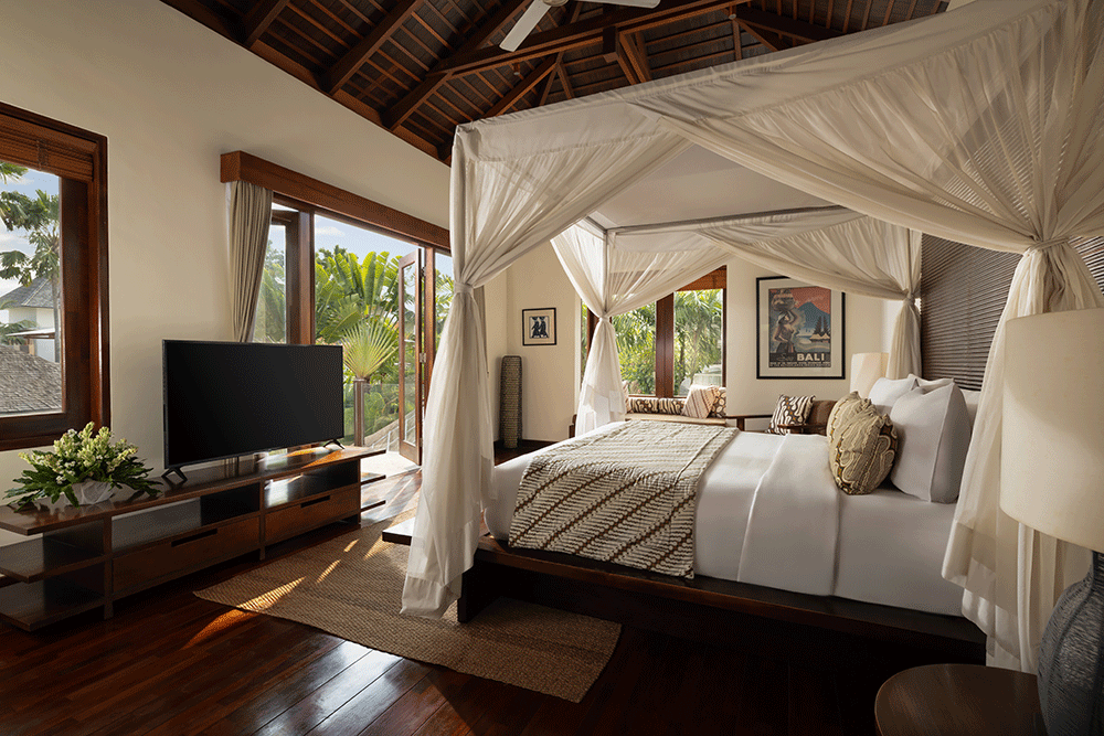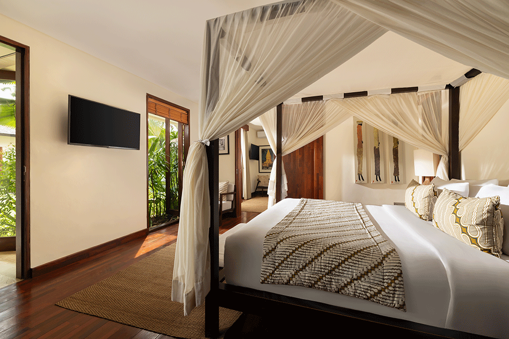 The Suar Seminyak is designed with spaciousness and versatility in mind. The villa’s open-concept living room invites natural light, blending seamlessly with the outdoor ambiance. Overlooking the lush garden and pool, this space offers the perfect balance between indoor comfort and tropical charm. Whether it’s relaxing in the airy living area or gathering in the large dining room, each moment at The Suar Villas is framed by stylish Balinese accents and modern convenience. For those looking to unwind, the media room offers a cozy escape with a full entertainment setup, ideal for movie nights or a quiet workout session.
