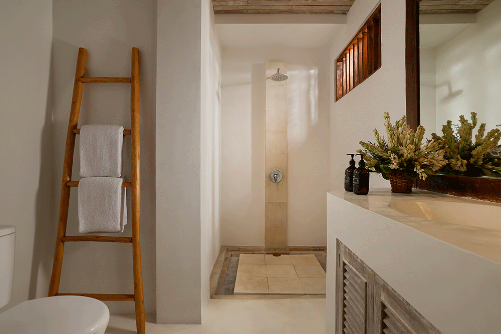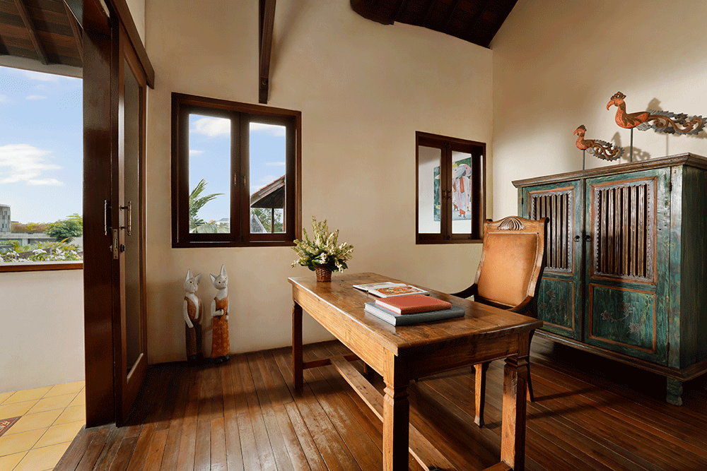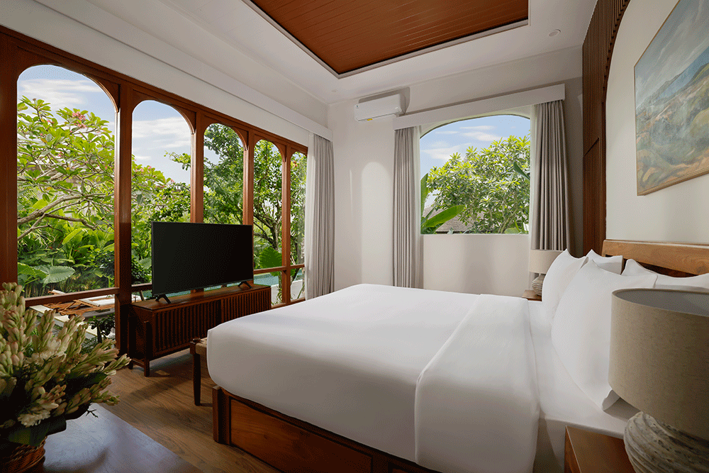 Large windows frame the tropical greenery outside, letting light and breeze move freely through the villa. It’s an indoor sanctuary that stays deeply connected to nature — where the indoors and outdoors flow as one.
