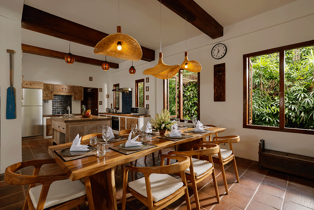 Inside Villa Tropical Svasti, every corner is designed to feel both open and intimate — a seamless blend of warmth and space. The indoor area invites slow mornings and easy gatherings, centered around a handcrafted wooden dining table made for shared meals and stories.